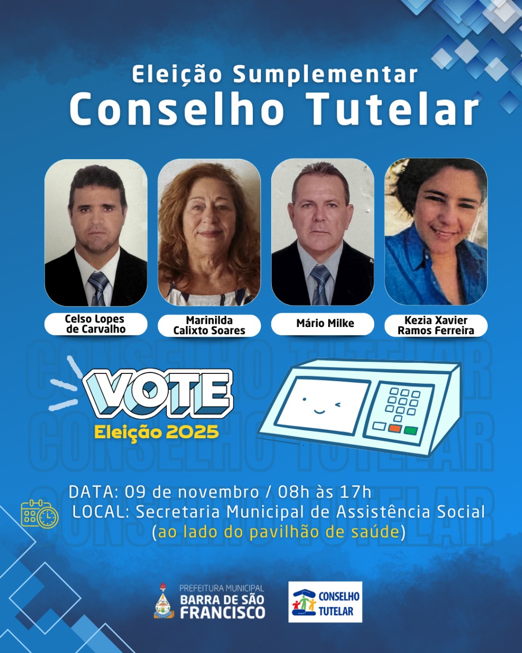 Os eleitores de Barra de São Francisco vão às urnas neste domingo, 09 de novembro, para participar da eleição suplementar do Conselho Tutelar. A votação definirá um novo conselheiro tutelar para compor o colegiado responsável pela defesa dos direitos de crianças e adolescentes no município.