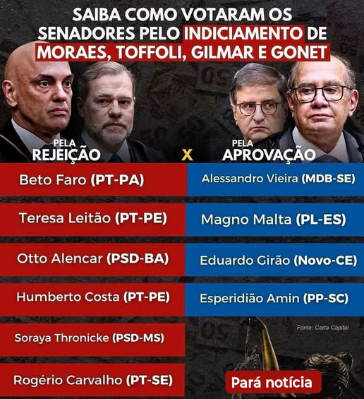 O Senado Federal rejeitou, nesta terça-feira (14), o relatório final da Comissão Parlamentar de Inquérito (CPI) do Crime Organizado que propunha o indiciamento de ministros do Supremo Tribunal Federal (STF) e do procurador-geral da República. O resultado, por 6 votos a 4, foi diretamente influenciado por uma articulação liderada por parlamentares do Partido dos Trabalhadores (PT), que atuaram para impedir a aprovação do parecer.