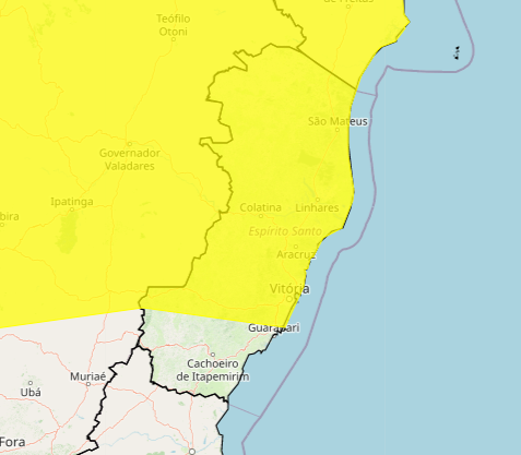 A previsão é de chuva entre 20 e 30 mm/h ou até 50 mm/dia, além de ventos intensos entre 40 e 60 km/h. Existe o baixo risco de corte de energia elétrica, queda de galhos de árvores, alagamentos e de descargas elétricas. Veja as cidades com alerta vigente: