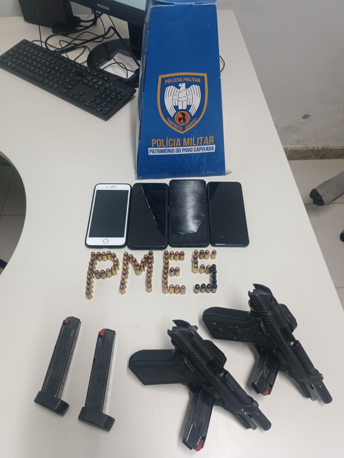 Durante as buscas, os policiais encontraram duas pistolas calibre .380 municiadas, 4 carregadores municiados, 75 munições .380 no total, e três celulares. Com o apoio da cadela Athena (K-9), da Força Tática, foram localizados também 16g de crack e uma munição avulsa.